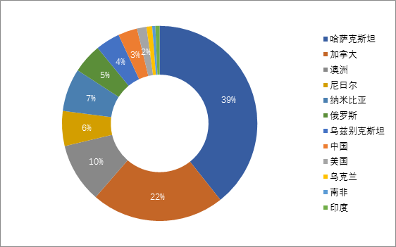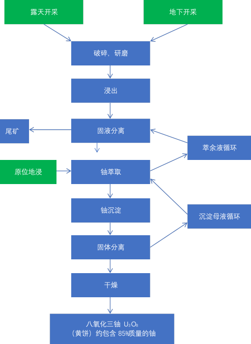 世界主要鈾礦的開采方式包括三種:原位地浸開采,露天開采及地下開采。世界約48%的天然鈾通過原位地浸開采生產出來,46%來自于常規開采方法(露天開采及地下開采)生產出來,6%作為其他礦產品副產品采出。 鈾礦開采生產工藝示意圖 2017年世界各國產鈾比例(總產量為59,531噸鈾) 原位地浸開采 原地浸出采鈾是將溶浸液通過注液鉆孔注入到可滲透的含礦含水層,使溶浸液在滲透過程中與鈾接觸并進行溶解反應,生成含鈾溶液,并從抽液孔被抽至地表,輸送到車間加工處理后獲得鈾產品的流程。 ? 適用賦存于含水及可滲透砂巖中鈾礦物開采。 ? 圈定鈾礦的邊界品位為0.001%。 ? 根據浸出機理的不同,分為酸法和堿法開采。 開采的適用條件: (1)含礦巖性應為具有滲透性的砂巖、砂礫巖。礦體賦存于地下水位以下的含礦含水層中。充水性和滲透性是地浸是否可行的決定性因素。 (2)礦體產狀平緩(傾角一般小于10度),礦體頂底板應是良好封閉的不透水層。 (3)礦床平米鈾量應在最低經濟指標之上,含礦含水層中碳酸鹽含量>2%則不宜用酸法浸出。圍巖以長石石英質或石英質砂巖最宜。 (4)按照目前鈾價,開采礦體最大埋藏深度不宜超過400-600m。 浸出機理 酸法 主要使用硫酸作為溶浸劑,礦石中鈾隨溶浸液pH值的下降2以下后從沉淀態變為溶解態,生成硫酸鈾酰溶液。含礦含水層中碳酸鹽含>2%則不適用。 堿法 主要使用碳酸氫銨作為溶浸劑,礦石中鈾隨溶浸液pH值上升到9以上后礦石中的6價鈾與碳酸鹽中的碳酸根(CO32-)絡合,生成碳酸鈾酰溶液。產品液鈾含量低,銨鹽也造成地下水污染。 二氧化碳+氧氣 原理是氧氣氧化礦石,在地下水中加入二氧化碳后,形成的碳酸氫根(HCO3-)離子與礦層中的鈾發生反應,使鈾溶解在溶液中,也屬于堿法浸出分類。 細菌浸出 主要選用氧化鐵硫桿菌,在浸出鈾的過程中,主要起間接催化作用,能促進黃鐵礦和硫酸亞鐵的氧化,促進6價鈾生成。可降低酸耗。需配合酸法使用,但并非一種獨立的浸出方法。 地浸的主要優點: (1)開采方法安全簡單、工藝流程短。采礦階段無需搬運、破碎礦石,水冶階段無需磨礦和固液分離,縮短了采冶工藝流程,直接生產成本低。 (2)礦山建設周期短、基建投資少,勞動強度低、自動化程度高,固定資產折舊低。 (3)環境污染小。一是抽注基本平衡,地浸溶液是在閉路管道內循環使用,其廢水排放量顯著減少;二是放射性粉塵污染得到徹底改善;三是尾渣和廢氣的污染減到了最低程度。 露天開采即一個移走礦體上的覆蓋物,從敞露地表的采礦場采出鈾礦物的過程。主要適用于主礦體埋藏較淺的鈾礦床開采。 主要優點包括: 1. 基建周期短。2-4年/大型 6-8月/小型。 2、開采空間大,勞動生產率高。比地下開采高2-10倍。 3、礦石損失、貧化率較小。損失率3%-5%貧化率5%-8%。 4、開采成本低,勞動條件好,生產安全?! ?/span> 主要缺點: 1、開采受到氣候影響大?! ?/span> 2、基建設備投資大。 3、礦山占地多,對地表環境破壞大。 地下開采即通過開掘井巷工程從地下礦床的礦塊里采出礦石的過程,通過礦床開拓、礦塊的采準、切割和回采4 個步驟實現。主要適用于埋藏較深及地表不允許露天開采的鈾礦床。以地壓管理方法為依據,分為空場采礦法充填采礦法、崩落采礦法三大類。