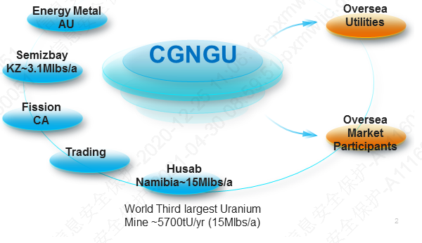 Established in the UK in July 2014, CGN Global Uranium Ltd. (CGNGU) was acquired by CGN Mining Co., Ltd. in January 2019, which is the only investment and financing platform for overseas uranium resource development by China General Nuclear Power Group (CGN). It is also the only overseas trading platform owned by CGN.